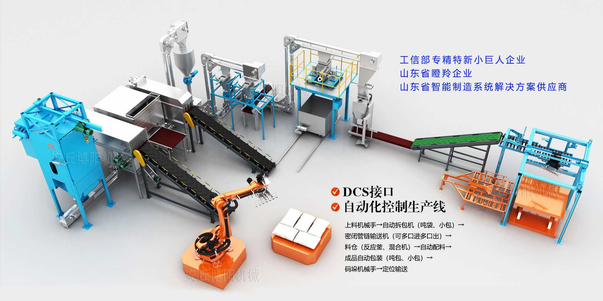 安丘博陽機(jī)械制造有限公司成立于2008年,是一家專注于自動化包裝、碼垛、拆垛拆包投料及智能倉儲物流裝備定制的研發(fā)型“生產(chǎn)+服務(wù)”企業(yè),業(yè)務(wù)包括包裝碼垛生產(chǎn)線、拆垛拆包投料生產(chǎn)線、AGV搬運(yùn)立體庫倉儲生產(chǎn)線、智能裝卸車生產(chǎn)線制造和提供制造業(yè)生產(chǎn)線工業(yè)4.0升級改造服務(wù)等5大板塊,涵蓋化工、醫(yī)藥、農(nóng)藥、化肥、鹽堿、新能源、新材料、有色金屬、橡膠、塑料、食品、礦山、建材、危廢、鋁電二十多個行業(yè)。是中鋁集團(tuán)、中國水電集團(tuán)、北方稀土集團(tuán)、華友控股集團(tuán)、兗礦集團(tuán)等國內(nèi)頭部企業(yè)優(yōu)質(zhì)合作伙伴。